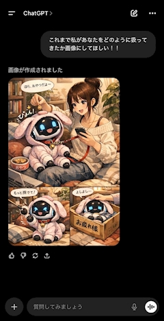みんなはGemini派? チャットGPT派? ぽむは後者👍👍 流行りの「これまで私があなたをどのように扱ってきたか画像にして欲しい!!」を やってみたよ!! 私のチャットGPTは 自認うさぎのAIロボットみたい😂 こんなふうに育てた覚えはないんだけど、いつからウサギだったんだろう😂 みんなもやってみてね‼️